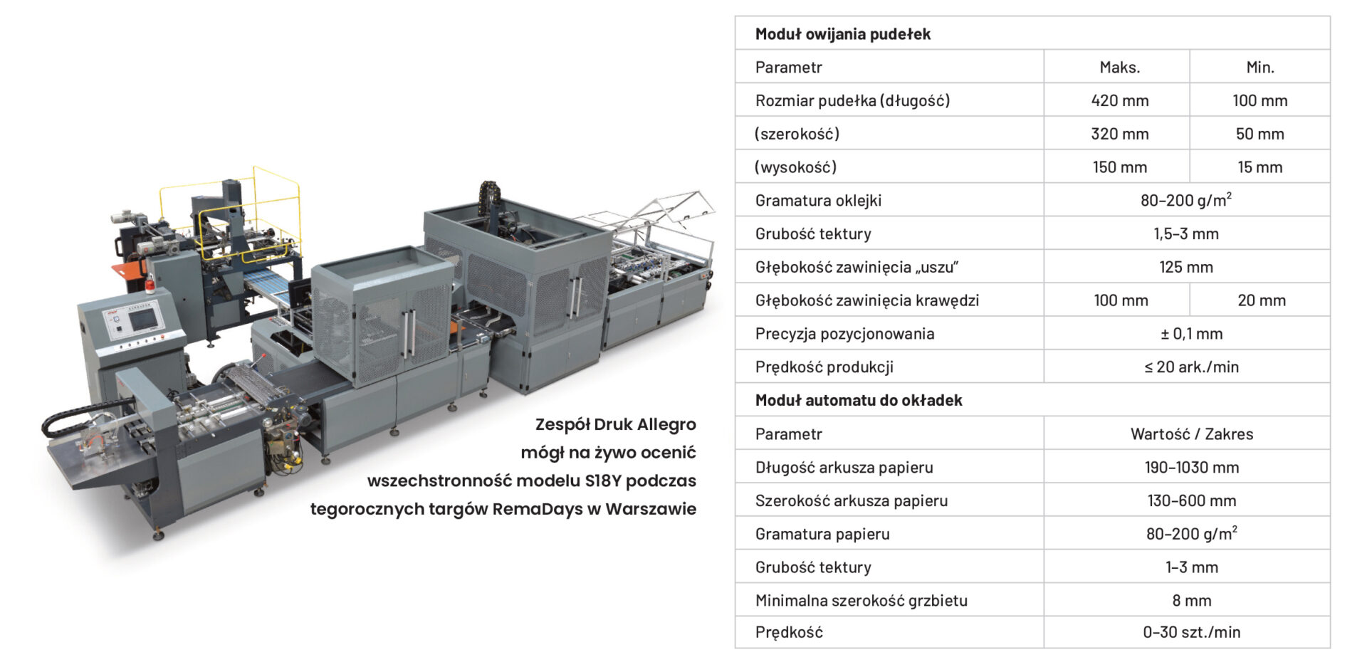 Kolejnym etapem weryfikacji możliwości technologicznych były targi RemaDays w Warszawie. To tam zespół Druk Allegro mógł na żywo ocenić wszechstronność modelu S18Y, obserwując maszynę pracującą w dedykowanych cyklach, zarówno podczas precyzyjnego formowania okładek, jak i w procesie montażu luksusowych pudełek typu premium.